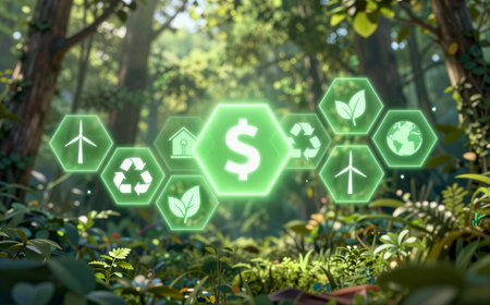 Ecology, sustainable resources, renewable energy concept. A fern sprout surrounded by green energy symbols. Graphic design from a photograph. Dark green natural bright background. copy space
