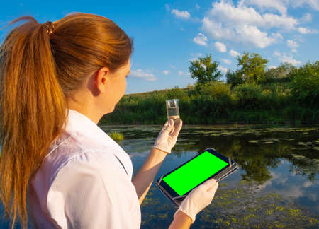 the laboratory assistant stands on the shore of the reservoir with a water sample and a tablet, the concept of ecology