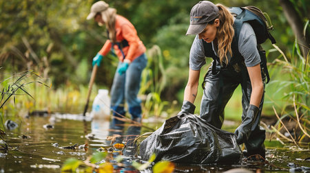 A group of women volunteers are collecting plastic trash along the river. ai
