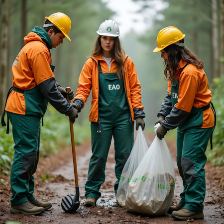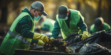 Team of workers in green vests and gloves diligently collect trash bags. Concept Sustainability, Environmental Conservation, Teamwork, Community Service, Waste Management