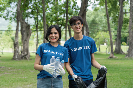 Young Volunteers with garbage bags cleaning park area. Ecology, Charitable organization concept. Generative AI