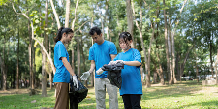 Group of volunteers collects garbage in bags, taking care of nature, cleaning the park, street garbage and trash. Generative AI