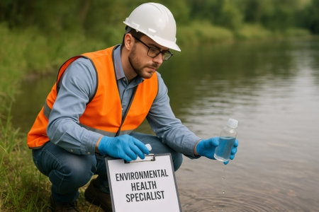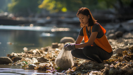 A dedicated environmental scientist is collecting water samples in a natural setting, highlighting the importance of ecological research and analysis.