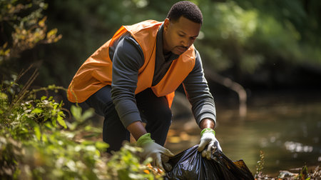 Young African-American man picking up garbage in the forest. This file is cleaned and retouched.