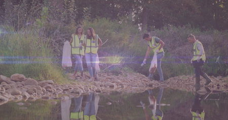 Image of lights moving over happy diverse group cleaning up rubbish in countryside. eco conservation volunteer month digitally image.