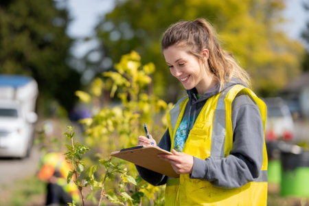 A joyful young woman in a yellow safety vest records observations while participating in community gardening efforts in a local park. Volunteers work in the background.