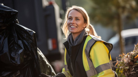 A happy female waste management expert working outdoors.