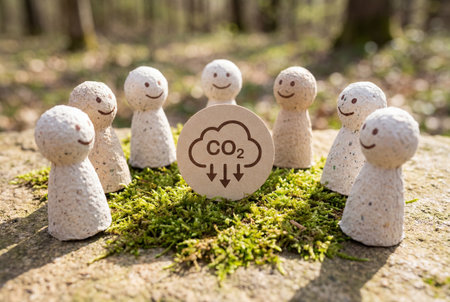 A diverse group of seven small wooden figures with smiling faces are arranged in a circle around a central CO2 reduction symbol, placed on a mossy patch in a natural forest environment