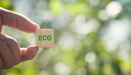 Male hand holding ECO word in wooden cube.