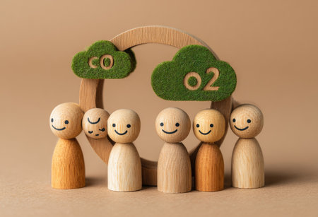 A group of wooden figures stand beneath a wooden arch with green clouds labeled CO2 and O2, representing the exchange of gases. The scene features warm lighting and a neutral background. This composition is suitable for illustrating environmental themes and concepts related to sustainability. Suitable for use in educational materials.