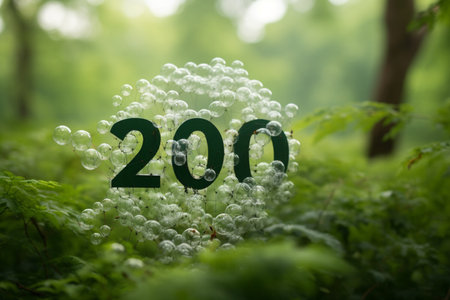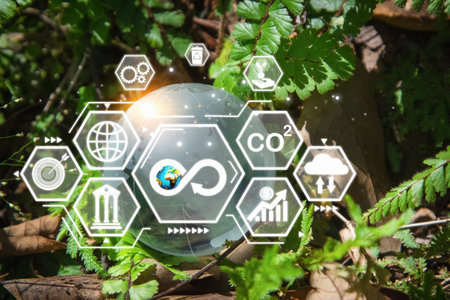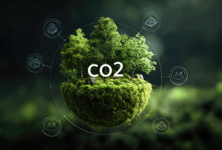 A digital illustration depicts a spherical landmass covered in green foliage and trees, with the word CO2 prominently displayed. The composition features a natural aesthetic with soft lighting and a blurred background, set within a natural environment. Conceptual elements and icons suggest environmental themes, ideal for various commercial uses.