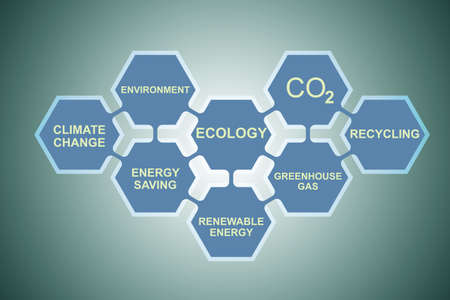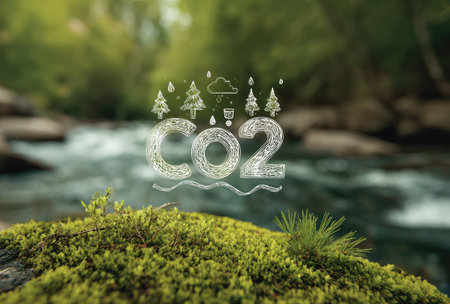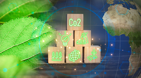 The image features an illustration of CO2, with visual elements of nature in the background. The composition uses a green and blue color scheme, with hints of graphic design. This image could be used for editorials on environmental topics, climate change discussions, or presentations on sustainability. It avoids any mention of specific locations or brands.