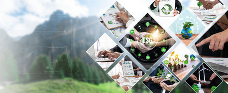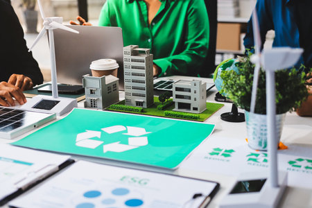 Top view ESG investment project with business leaders in meeting, brainstorm and invest in green project for environmental protection with sustainable net zero and renewable energy technology.Reliance