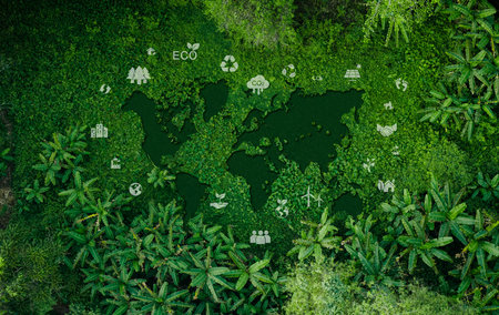 World map and earth conservation icons on grass and banana trees in forest aerial view