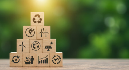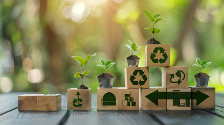 Wooden blocks with eco-friendly symbols and small plants growing, representing sustainable growth, recycling, and environmental conservation.