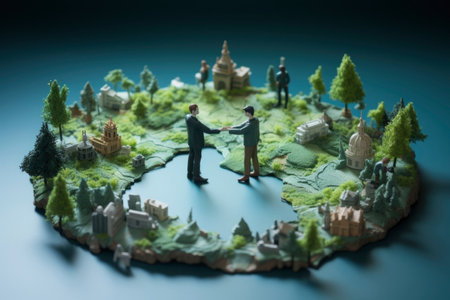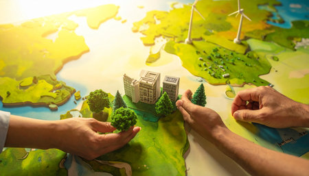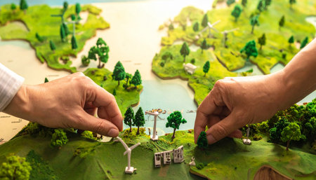 Two pairs of hands collaborate, carefully placing miniature trees on a lush, green 3D model of the world.