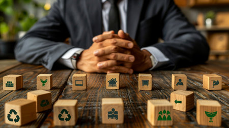 A businessman surrounded by cascading wooden blocks with green eco friendly icons