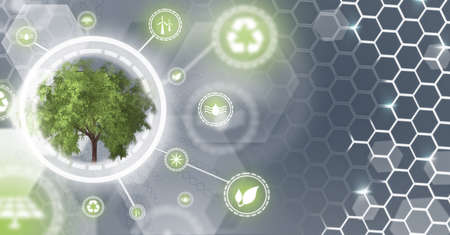 Eco technology or environmental technology concept with environment Icons over the network connection on green leaf energy sources for renewable, sustainable development.
