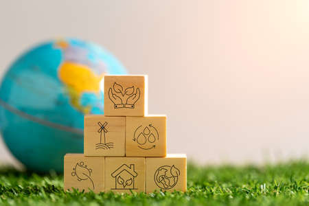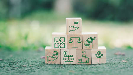 Set of environment, social, and governance ESG concept. The wooden block with thin line icons such as sustainable ecological, save water and energy, honest people.