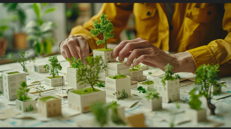 Man modeling sustainable green city concept with eco friendly white buildings and small trees from paper, representing urban planning and environmental conservation. Generative ai.