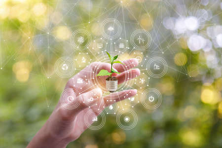 Hand planting trees with technology of renewable resources to reduce pollution ESG icon concept in hand for environmental, social and sustainable business governance.