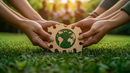 A group of people working together to assemble a puzzle that symbolizes the reduction of CO2 emissions, indicating a collaborative effort towards environmental sustainability.