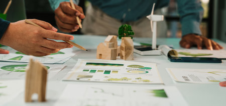 A collaborative team engages in a sustainable design project, analyzing green concepts and innovative ideas with charts and wooden models in a modern office setting.