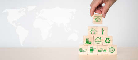 Stacking wooden cube with eco infinity and environment sustainable symbols on smart backgound.