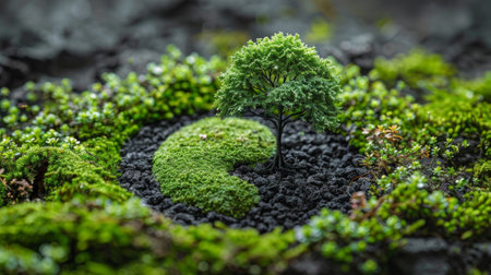 An artistic representation of Earth featuring a globe and a small tree on lush green moss, symbolizing nature, sustainability, and ecological balance.