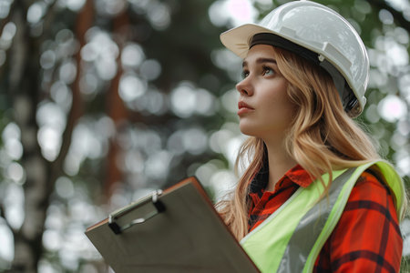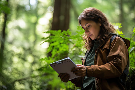 Female environmental surveyor observes forest conditions using binoculars, takes notes, communicates data. Environmental monitoring, biodiversity tracking, role of women in filed forest assessment.
