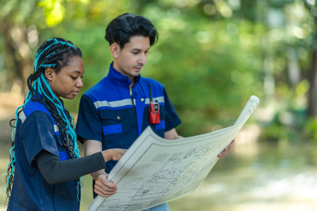 The supervisors are constructing roads in the forest. Young Engineer female holding blueprint on hand. Engineer team working on project at the forest. Technical operaters and Labourers.