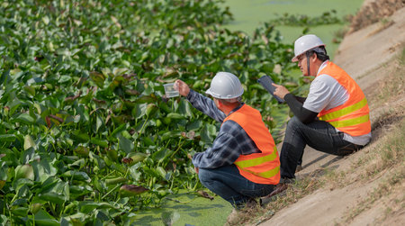 Environmental Engineer Testing Water Quality at Drainage Site, Field Scientists with Walkie Talkie and Laptop Conducting Water Pollution Analysis Outdoors