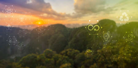 Abstract icon representing the sustainable development on renewable energy and growing ecological on green energy concept, Earth Day, Ecology and Environment concept, Earth Day, Forest conservation concept,The background is a mountain.