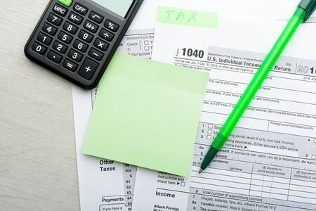 Annual tax form under US law with culculator. Tax payment concept