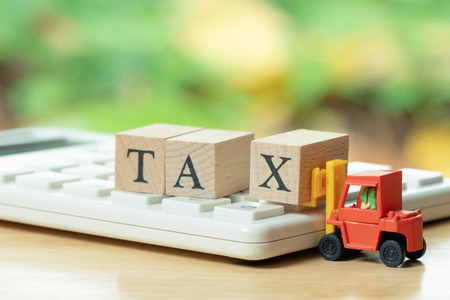 The image shows a black calculator, a wooden block with the word TAX written on it, and two stacks of coins. The calculator has a display screen and several buttons, including numerical keys and function keys.