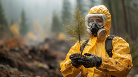 Person in protective hazmat gear with a plant symbol, standing against a backdrop of pollution and factories, representing environmental crisis and contamination.