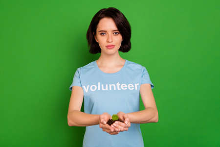 Close-up portrait of her she nice attractive lovely candid peaceful kind girl wearing, blue t-shirt holding in hands natural ground save plant isolated over bright vivid shine vibrant green background