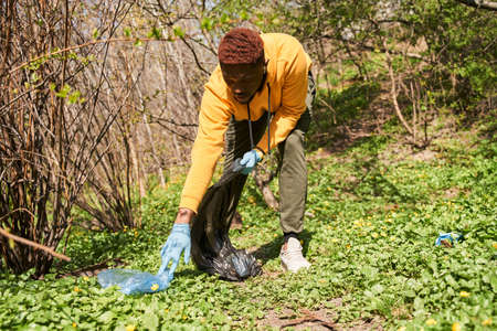 Man picking up plastic waste on the river bank. Environmental pollution concept.
