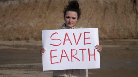 Young woman volunteer activist holding an environmental poster Save Earth demonstrates against protection environment, pollution nature