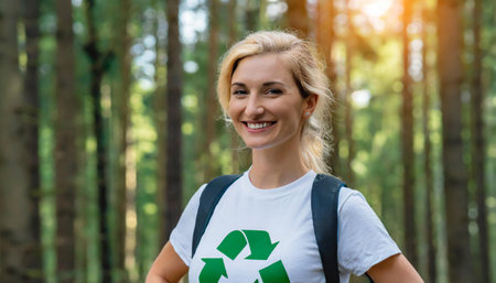 Young volunteer woman holding paper with green recycling sign over blurred natural background. Eco living, environment, sustainability concept. Generative ai.