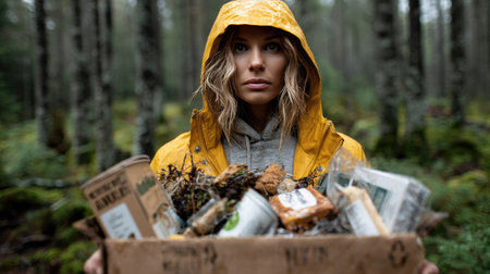 A determined woman in a bright yellow rain jacket stands in a lush forest, holding a box filled with waste items, promoting awareness for environmental conservation.