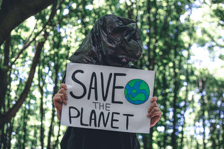 Portrait of young woman in nature holding a banner with the text Save the planet. Female with banners protesting over pollution and global warming in the forest to save planet earth. Concept of World