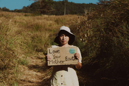 Portrait shot of Asian young female eco acivist standing in tropical forest have been destroyed for corn plantation and holding poster with words Love your Mother Earth in hands. climate change concep