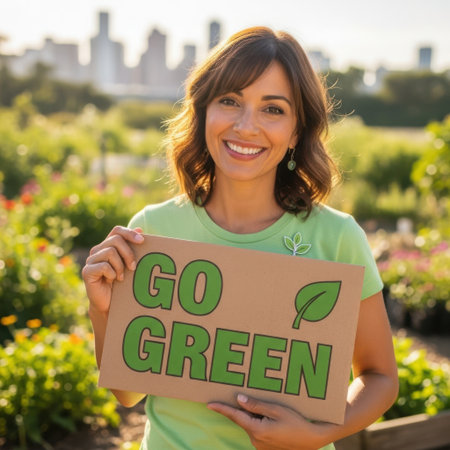 A smiling woman holds a Go Green sign in a lush garden setting with a city skyline visible in the soft-focus background, promoting environmental consciousness and sustainability.