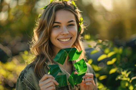 A woman with long blonde hair, wearing a leafy headband, smiles as she holds up a green recycle symbol made of leaves. The symbol is in front of her face. The backdrop is a soft focus of lush green foliage.