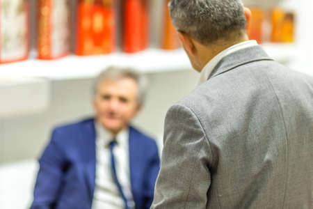BOLOGNA, ITALY - FEBRUARY 18, 2019: booth presenter talking with visitor at stand of SICOM in DEVOTIO Religious products and service exhibition