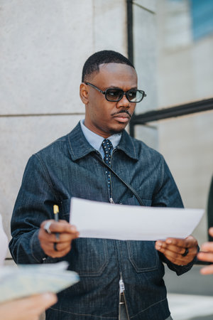 Man reviewing documents while holding a pen outdoors in a professional setting