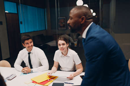 Forecast affiliates meeting in boardroom office to review latest business environment news and progress. Coworkers and general manager training to expand the enterprise globally.