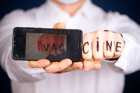 Florence, June 2021: Hand of doctor hold hypothetical vial of Covid-19 vaccine to immunize from the Delta Variant Coronavirus with document papers of WHO on background.