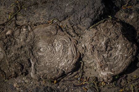 Broken fragments of prehistoric ammonite fossils from the Jurassic age in the Spiti Valley.